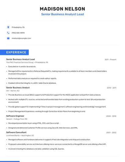 Build a professional senior business analyst lead resume in minutes. Browse through our resume examples to identify the best way to word your resume. Then choose from 5+ resume templates to create your senior business analyst lead resume.