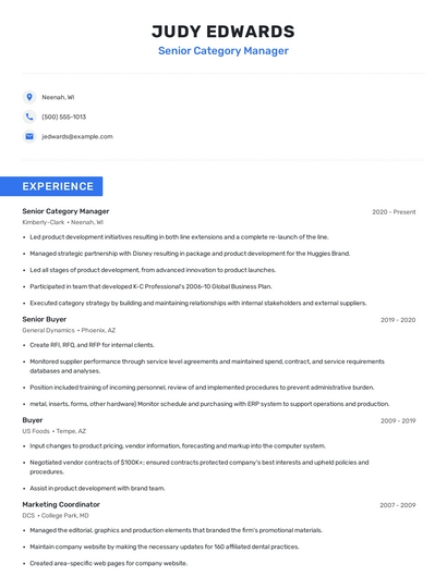 Build a professional senior category manager resume in minutes. Browse through our resume examples to identify the best way to word your resume. Then choose from 5+ resume templates to create your senior category manager resume.