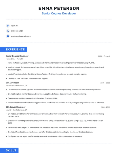Build a professional senior cognos developer resume in minutes. Browse through our resume examples to identify the best way to word your resume. Then choose from 5+ resume templates to create your senior cognos developer resume.