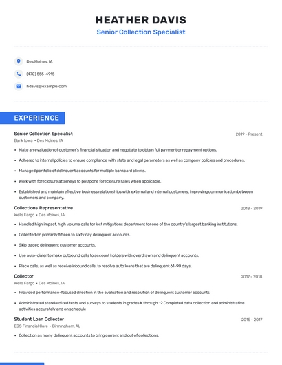 Build a professional senior collection specialist resume in minutes. Browse through our resume examples to identify the best way to word your resume. Then choose from 5+ resume templates to create your senior collection specialist resume.
