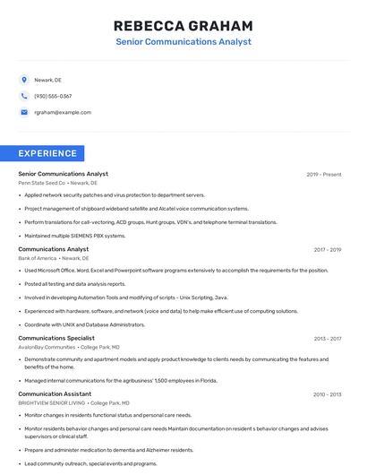 Build a professional senior communications analyst resume in minutes. Browse through our resume examples to identify the best way to word your resume. Then choose from 5+ resume templates to create your senior communications analyst resume.