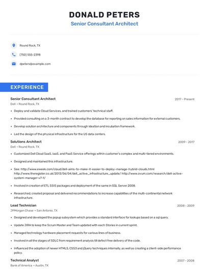 Build a professional senior consultant architect resume in minutes. Browse through our resume examples to identify the best way to word your resume. Then choose from 5+ resume templates to create your senior consultant architect resume.