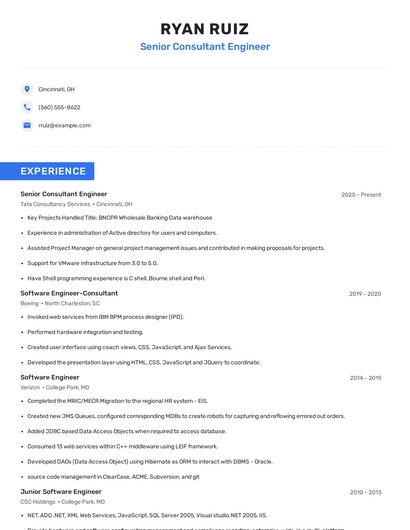 Build a professional senior consultant engineer resume in minutes. Browse through our resume examples to identify the best way to word your resume. Then choose from 5+ resume templates to create your senior consultant engineer resume.