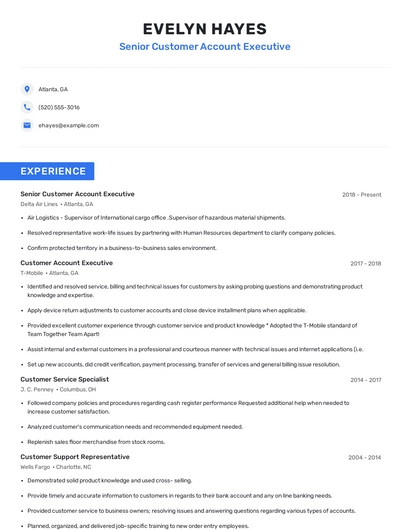 Build a professional senior customer account executive resume in minutes. Browse through our resume examples to identify the best way to word your resume. Then choose from 5+ resume templates to create your senior customer account executive resume.