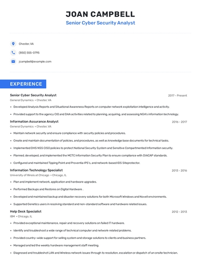 Build a professional senior cyber security analyst resume in minutes. Browse through our resume examples to identify the best way to word your resume. Then choose from 5+ resume templates to create your senior cyber security analyst resume.
