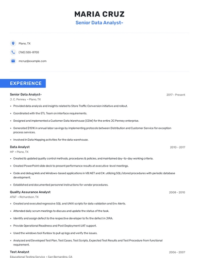 Build a professional senior data analyst- resume in minutes. Browse through our resume examples to identify the best way to word your resume. Then choose from 5+ resume templates to create your senior data analyst- resume.
