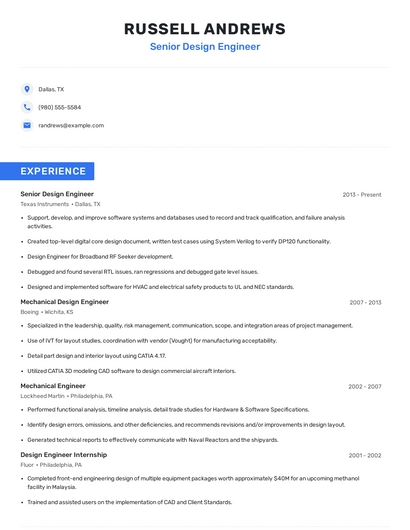 Build a professional senior design engineer resume in minutes. Browse through our resume examples to identify the best way to word your resume. Then choose from 5+ resume templates to create your senior design engineer resume.
