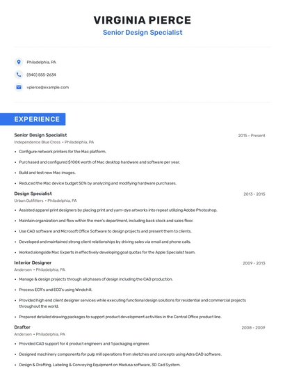 Build a professional senior design specialist resume in minutes. Browse through our resume examples to identify the best way to word your resume. Then choose from 5+ resume templates to create your senior design specialist resume.