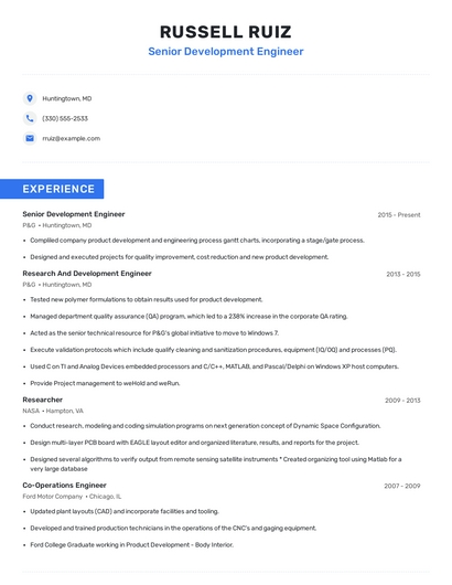 Build a professional senior development engineer resume in minutes. Browse through our resume examples to identify the best way to word your resume. Then choose from 5+ resume templates to create your senior development engineer resume.