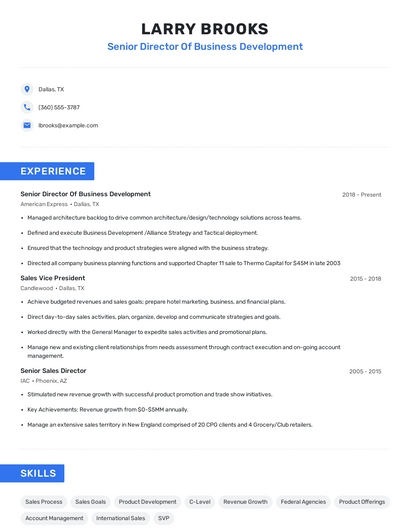 Build a professional senior director of business development resume in minutes. Browse through our resume examples to identify the best way to word your resume. Then choose from 5+ resume templates to create your senior director of business development resume.