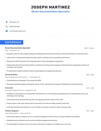 Build a professional senior documentation specialist resume in minutes. Browse through our resume examples to identify the best way to word your resume. Then choose from 5+ resume templates to create your senior documentation specialist resume.