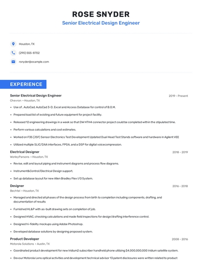 Build a professional senior electrical design engineer resume in minutes. Browse through our resume examples to identify the best way to word your resume. Then choose from 5+ resume templates to create your senior electrical design engineer resume.