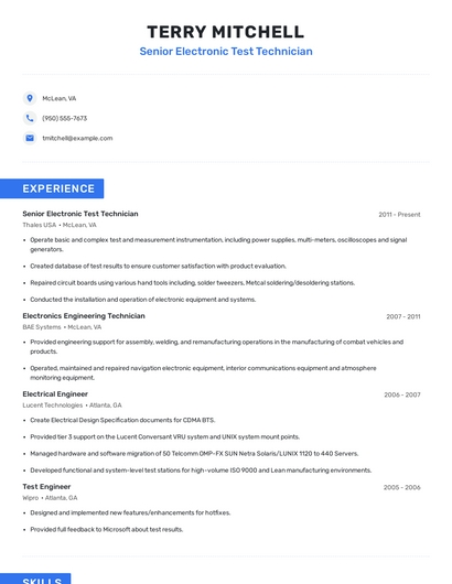 Build a professional senior electronic test technician resume in minutes. Browse through our resume examples to identify the best way to word your resume. Then choose from 5+ resume templates to create your senior electronic test technician resume.