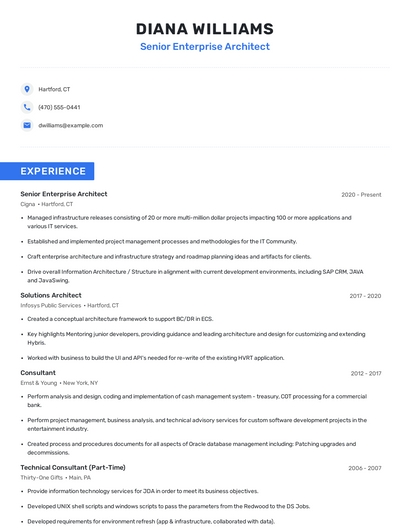 Build a professional senior enterprise architect resume in minutes. Browse through our resume examples to identify the best way to word your resume. Then choose from 5+ resume templates to create your senior enterprise architect resume.