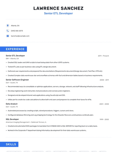 Build a professional senior etl developer resume in minutes. Browse through our resume examples to identify the best way to word your resume. Then choose from 5+ resume templates to create your senior etl developer resume.