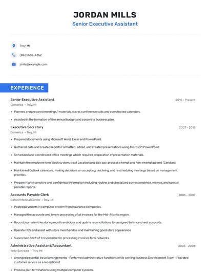 Build a professional senior executive assistant resume in minutes. Browse through our resume examples to identify the best way to word your resume. Then choose from 5+ resume templates to create your senior executive assistant resume.