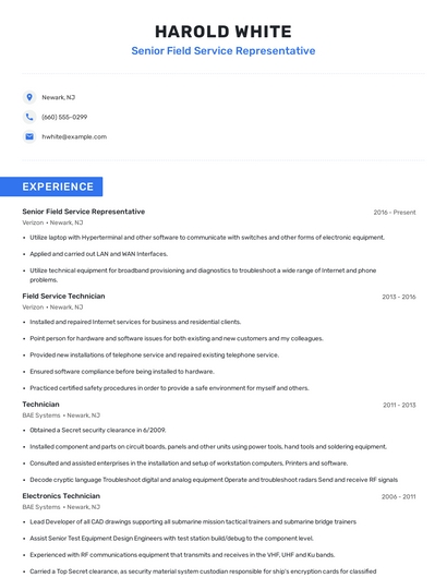 Build a professional senior field service representative resume in minutes. Browse through our resume examples to identify the best way to word your resume. Then choose from 5+ resume templates to create your senior field service representative resume.