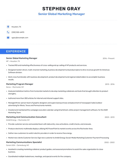 Build a professional senior global marketing manager resume in minutes. Browse through our resume examples to identify the best way to word your resume. Then choose from 5+ resume templates to create your senior global marketing manager resume.