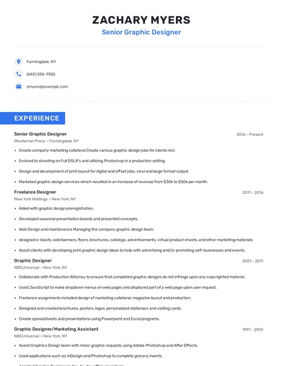 Build a professional senior graphic designer resume in minutes. Browse through our resume examples to identify the best way to word your resume. Then choose from 5+ resume templates to create your senior graphic designer resume.