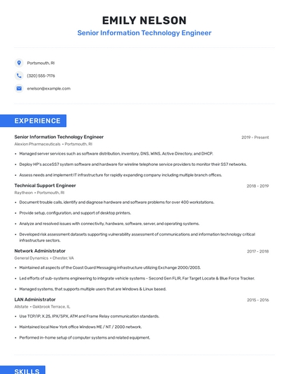 Build a professional senior information technology engineer resume in minutes. Browse through our resume examples to identify the best way to word your resume. Then choose from 5+ resume templates to create your senior information technology engineer resume.
