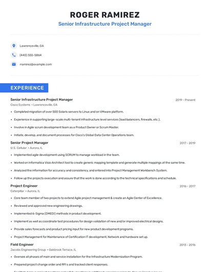 Build a professional senior infrastructure project manager resume in minutes. Browse through our resume examples to identify the best way to word your resume. Then choose from 5+ resume templates to create your senior infrastructure project manager resume.