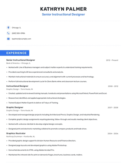 Build a professional senior instructional designer resume in minutes. Browse through our resume examples to identify the best way to word your resume. Then choose from 5+ resume templates to create your senior instructional designer resume.