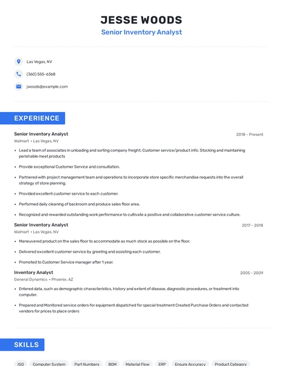 Build a professional senior inventory analyst resume in minutes. Browse through our resume examples to identify the best way to word your resume. Then choose from 5+ resume templates to create your senior inventory analyst resume.