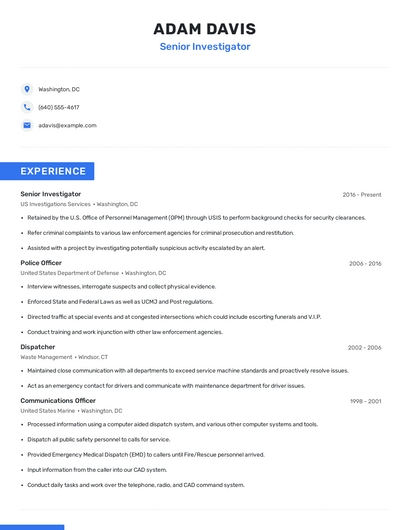Build a professional senior investigator resume in minutes. Browse through our resume examples to identify the best way to word your resume. Then choose from 5+ resume templates to create your senior investigator resume.