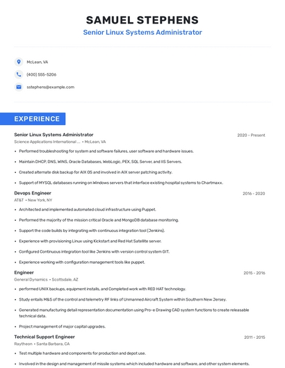 Build a professional senior linux systems administrator resume in minutes. Browse through our resume examples to identify the best way to word your resume. Then choose from 5+ resume templates to create your senior linux systems administrator resume.