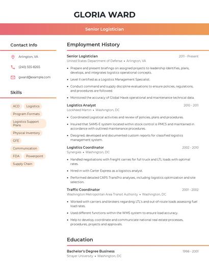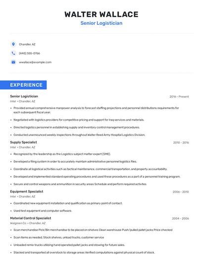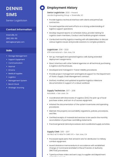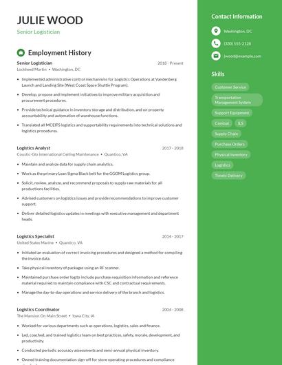 You can use Zippia's AI resume builder to make the resume writing process easier while also making sure that you include key information that hiring managers expect to see on a senior logistician resume. You'll find resume tips and examples of skills, responsibilities, and summaries, all provided by Zippi, your career sidekick.
