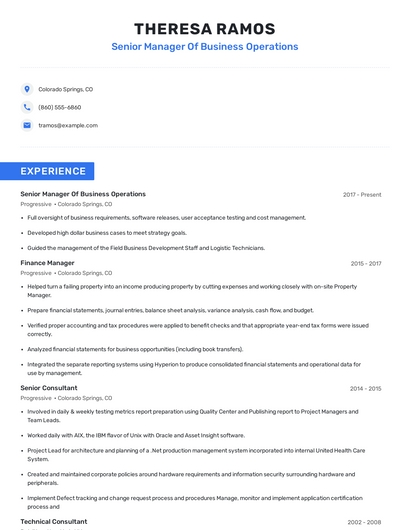 Build a professional senior manager of business operations resume in minutes. Browse through our resume examples to identify the best way to word your resume. Then choose from 5+ resume templates to create your senior manager of business operations resume.