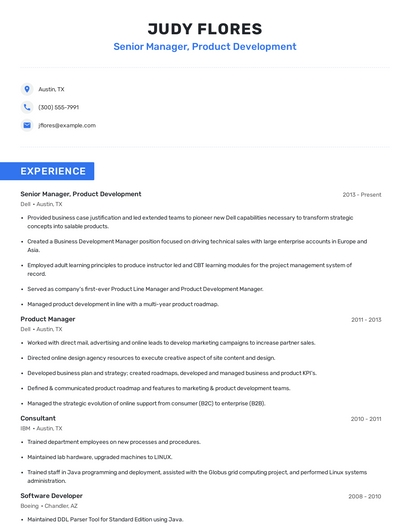 Build a professional senior manager, product development resume in minutes. Browse through our resume examples to identify the best way to word your resume. Then choose from 5+ resume templates to create your senior manager, product development resume.
