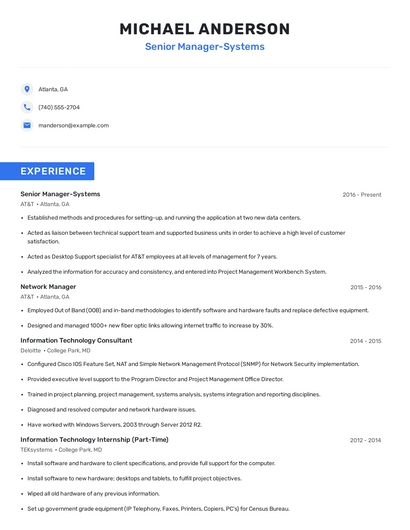 Build a professional senior manager-systems resume in minutes. Browse through our resume examples to identify the best way to word your resume. Then choose from 5+ resume templates to create your senior manager-systems resume.