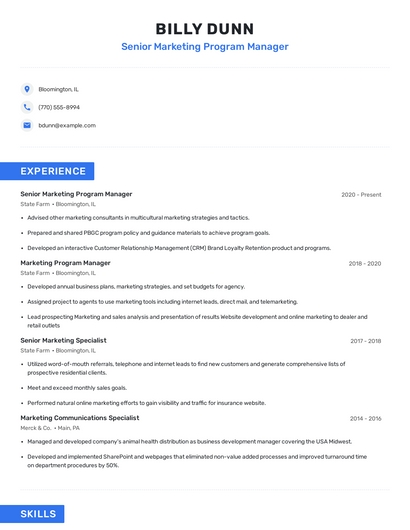 Build a professional senior marketing program manager resume in minutes. Browse through our resume examples to identify the best way to word your resume. Then choose from 5+ resume templates to create your senior marketing program manager resume.