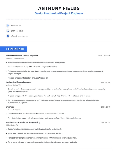 Build a professional senior mechanical project engineer resume in minutes. Browse through our resume examples to identify the best way to word your resume. Then choose from 5+ resume templates to create your senior mechanical project engineer resume.