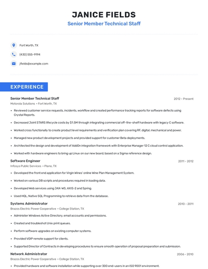 Build a professional senior member technical staff resume in minutes. Browse through our resume examples to identify the best way to word your resume. Then choose from 5+ resume templates to create your senior member technical staff resume.