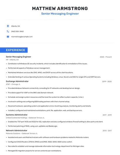 Build a professional senior messaging engineer resume in minutes. Browse through our resume examples to identify the best way to word your resume. Then choose from 5+ resume templates to create your senior messaging engineer resume.
