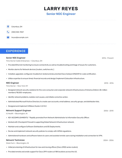 Build a professional senior noc engineer resume in minutes. Browse through our resume examples to identify the best way to word your resume. Then choose from 5+ resume templates to create your senior noc engineer resume.