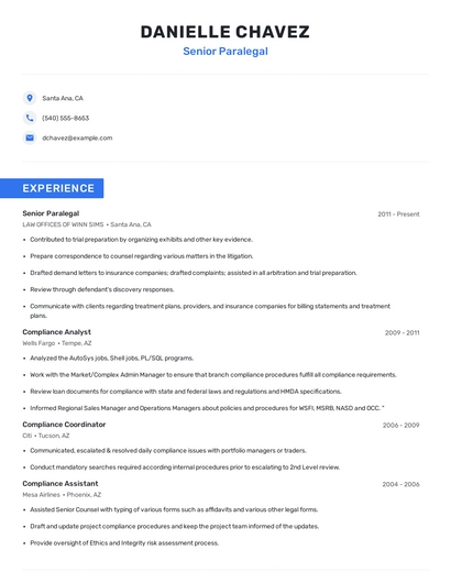 Build a professional senior paralegal resume in minutes. Browse through our resume examples to identify the best way to word your resume. Then choose from 5+ resume templates to create your senior paralegal resume.