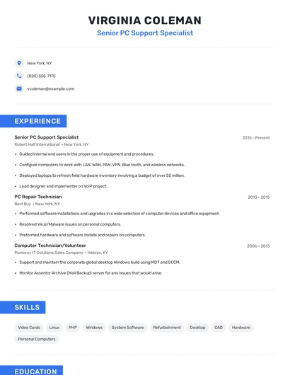 Build a professional senior pc support specialist resume in minutes. Browse through our resume examples to identify the best way to word your resume. Then choose from 5+ resume templates to create your senior pc support specialist resume.