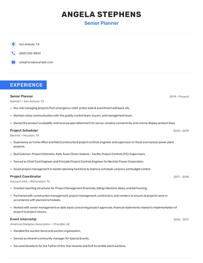 Build a professional senior planner resume in minutes. Browse through our resume examples to identify the best way to word your resume. Then choose from 5+ resume templates to create your senior planner resume.