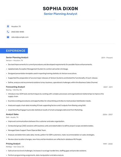 Build a professional senior planning analyst resume in minutes. Browse through our resume examples to identify the best way to word your resume. Then choose from 5+ resume templates to create your senior planning analyst resume.
