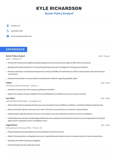 Build a professional senior policy analyst resume in minutes. Browse through our resume examples to identify the best way to word your resume. Then choose from 5+ resume templates to create your senior policy analyst resume.