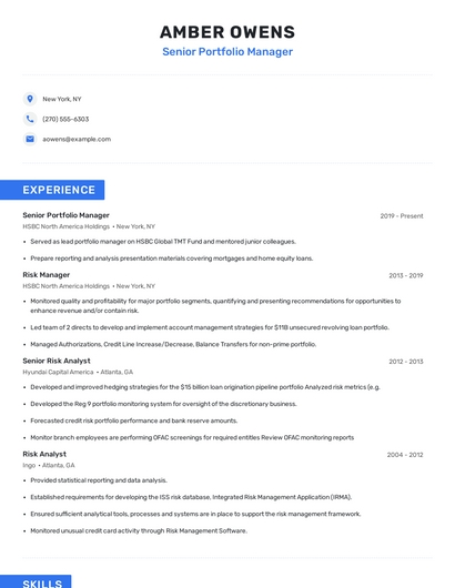 Build a professional senior portfolio manager resume in minutes. Browse through our resume examples to identify the best way to word your resume. Then choose from 5+ resume templates to create your senior portfolio manager resume.