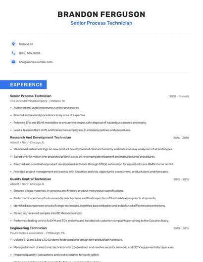 Build a professional senior process technician resume in minutes. Browse through our resume examples to identify the best way to word your resume. Then choose from 5+ resume templates to create your senior process technician resume.