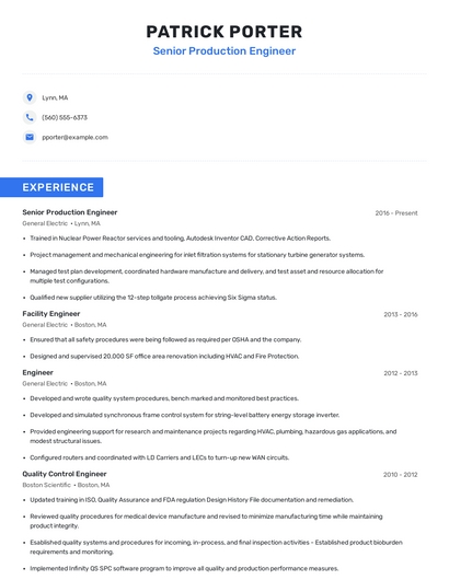 Build a professional senior production engineer resume in minutes. Browse through our resume examples to identify the best way to word your resume. Then choose from 5+ resume templates to create your senior production engineer resume.