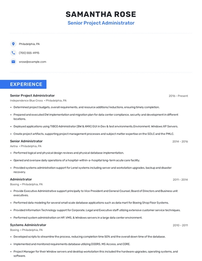 Build a professional senior project administrator resume in minutes. Browse through our resume examples to identify the best way to word your resume. Then choose from 5+ resume templates to create your senior project administrator resume.