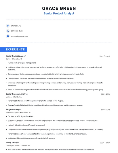 Build a professional senior project analyst resume in minutes. Browse through our resume examples to identify the best way to word your resume. Then choose from 5+ resume templates to create your senior project analyst resume.
