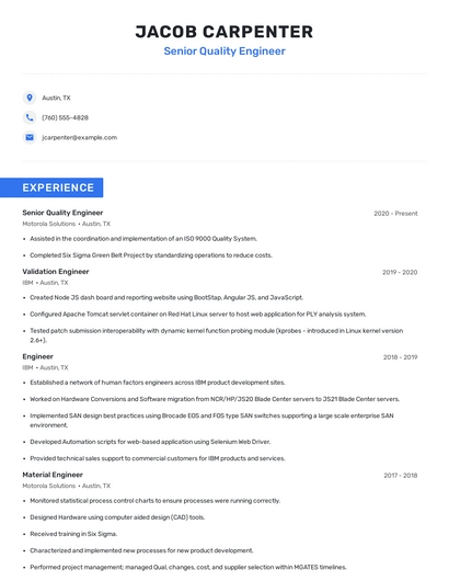 Build a professional senior quality engineer resume in minutes. Browse through our resume examples to identify the best way to word your resume. Then choose from 5+ resume templates to create your senior quality engineer resume.