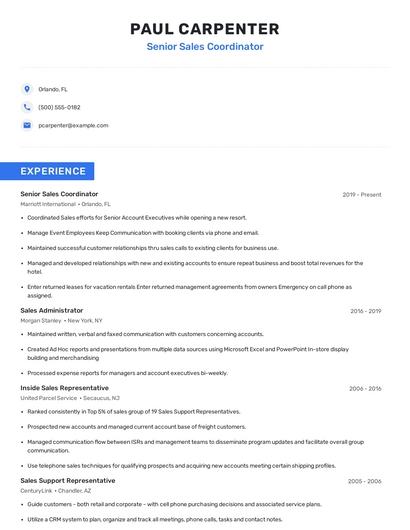Build a professional senior sales coordinator resume in minutes. Browse through our resume examples to identify the best way to word your resume. Then choose from 5+ resume templates to create your senior sales coordinator resume.